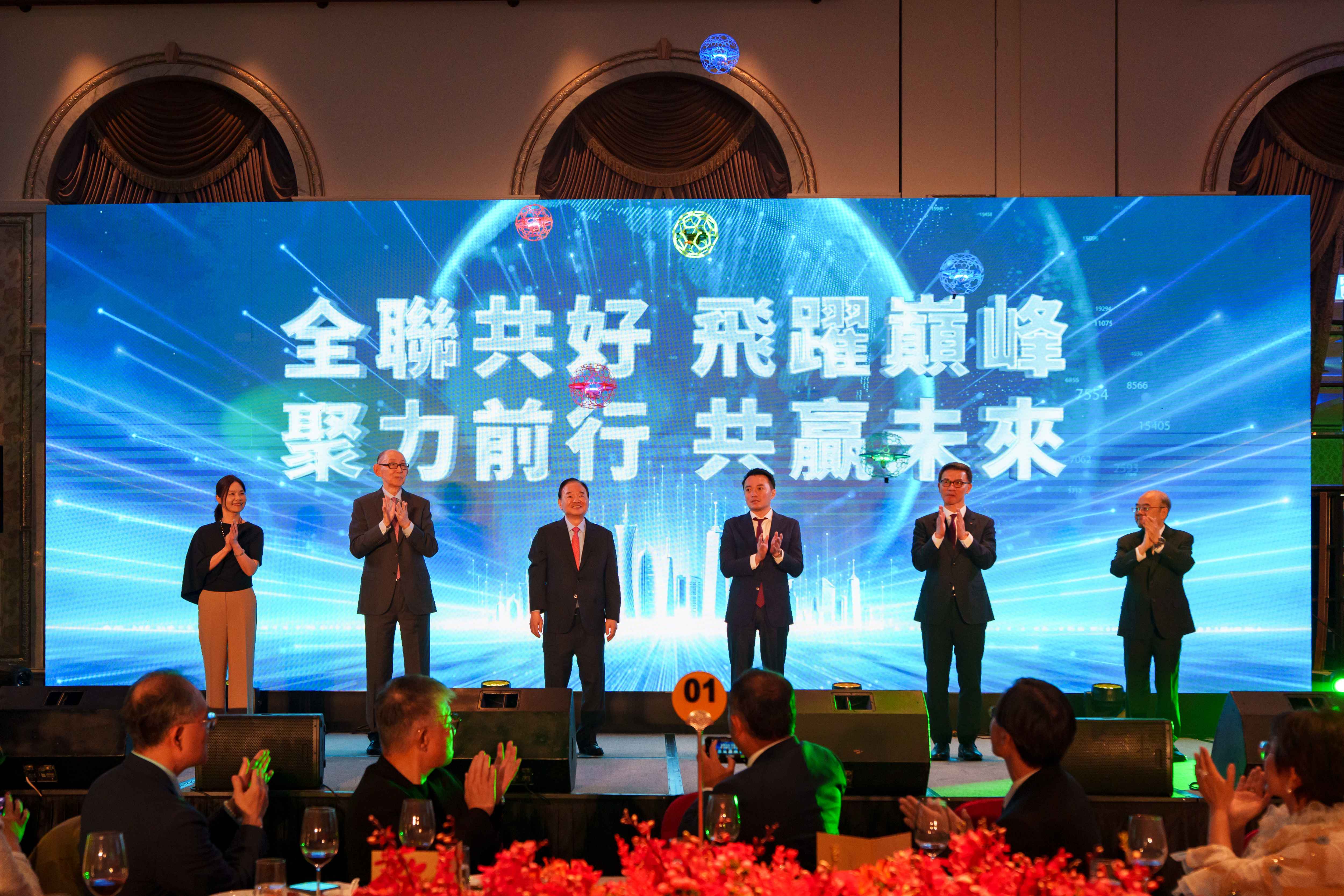 在這場以「共好」為核心的晚宴中,我們設計了極具象徵意義的開場:由 6 位長官與貴賓親手持光球,在全場倒數聲中,無人機伴隨光芒振翅高飛。這不只是視覺的震撼,更象徵著企業與合作夥伴將打破傳統框架,以更靈活的姿態與開闊的視野,共同飛越巔峰。